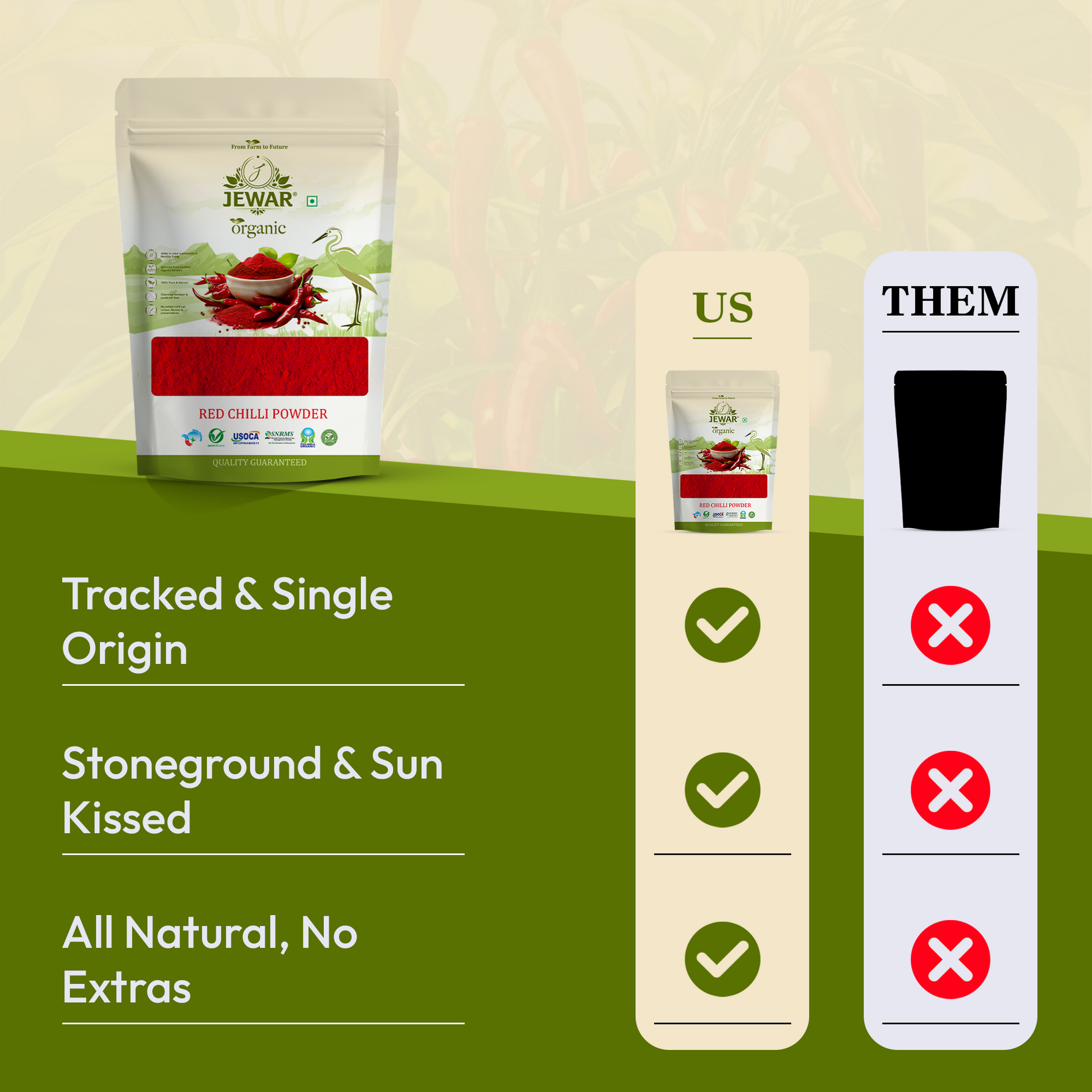 Add a bold kick to your dishes with Jewar Organic Red Chilli Powder. Made from sun-dried chillies, it gives vibrant color and fresh aroma. Perfect for curries, pickles, and chutneys – pure, flavorful, and free from additives!